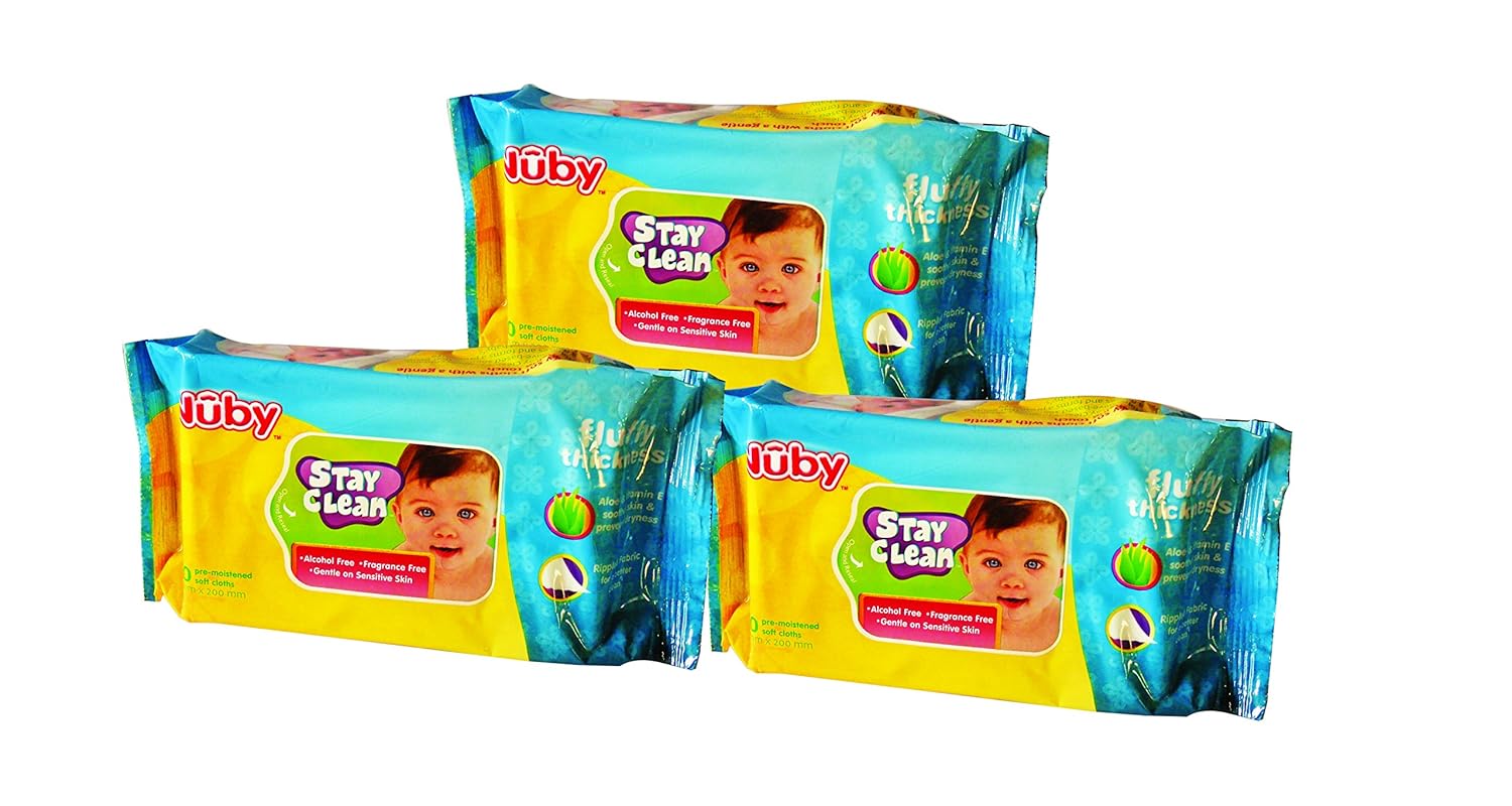 Nuby stay clean, soft cloths are a high quality non woven spunlace fabric with a ribbed surface for a better clean. Stay clean wipes are fragrance free, alcohol free, soap free and flourescent agent free. They are pH balanced. Aloe and vitamin E and chamomile are added to soothe and condition baby's delicate skin.The Nuby soft clean disposal wet wipes are enriched with jojoba oil which keeps the skin from drying up after a rigorous cleaning session. The wipes are soft and gentle, but are also very effective. These are also free of alcohol, making it safe and ideal for using on babies too. Those who are usually sensitive to such products need not worry at all since these are dermatologically tested and thereby also safe for your precious baby. These scent free baby wet wipes are gentle enough for your babys hands and face. Each package contains around 80 wipes which means that it lasts long and you need not worry about being left without them. The packaging makes it easy to carry around, be it in your hand bag or your babys diaper bag. You shall never be left unprepared again! These Nuby Soft Wet Wipes wipes are not only good for cleaning, but also instantly cools the area wiped, giving relief to your baby and you. Be careful to avoid the area around the eyes though and ensure that your baby does not swallow or attempt to chew on them. To keep the wipes super fresh, re-seal the package and always store them in a cool place, away from heat or direct sunlight. Heat dries up the tissues, making it difficult to clean your baby when in need. They should not be flushed as they may clog your drainage system.